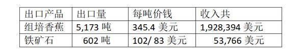 这期间直到7月18日为止,主要出口产品为组培香蕉(Tissue Banana)及铁矿石。该铁矿石中,铁的 百分比(Iron Concentrate)分别为64.512%及60.751% (Fe- 64.512%及Fe-60.751% )。