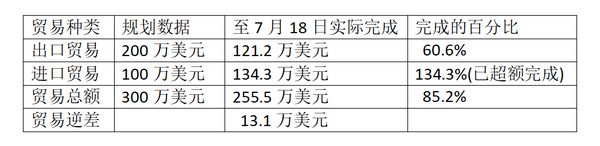 目前直到7月18日为止完成的交易额为,出口121.2万美元,进口134.3万美元,贸易总额为255.5万美元,完成本月份规划的85%的贸易总额。