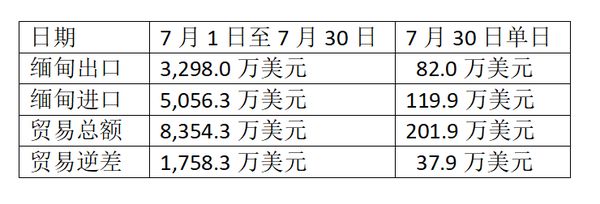 木姐105英里贸易区7月30日出口82万美元,进口119.9万美元,贸易总额201.9万美元。