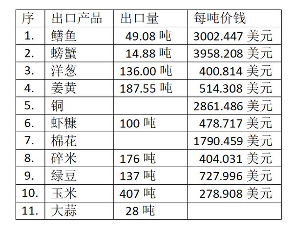 7月24日至7月30日这一周内出口最多的产品及每吨价钱如下: