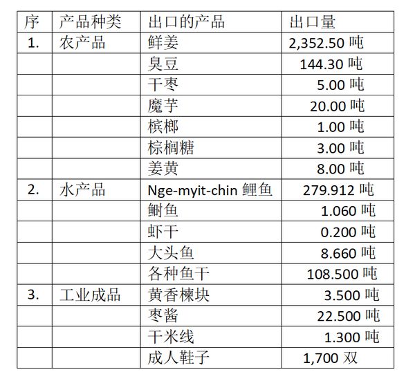 茂都贸易基地向孟加拉国出口的产品中,主要包括农产品、水产品及工业成品。在7月1日至7月30日这一个月期间,缅甸出口的产品如下: