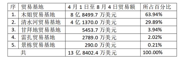 在缅中边境线上,为同邻国中国进行边贸交易往来,缅甸方面开设了五个边贸基地口岸,分别为木姐(Muse)、雷扎(Lweje)、清水河(Chinshwehaw)、甘拜地(Kampaiti)及景栋(Kengtung)等。这当中就数木姐贸易基地的交易额为最多。这四个月来各贸易基地所完成的贸易额如下表:
