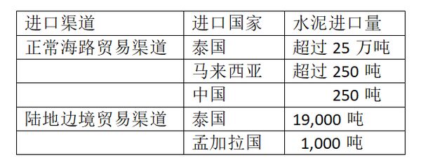 在目前的雨季季节中,缅甸自泰国进口超过25万吨的水泥,从马来西亚进口超过250吨的水泥,从中国进口250吨的水泥,这些都是通过海路渠道进口的。同时,缅甸还通过陆地边贸渠道自泰国进口19,000吨水泥,自孟加拉国进口1,000吨水泥。