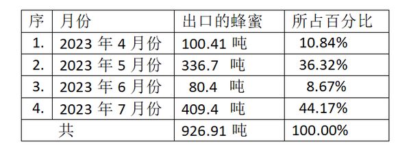 四个月出口蜂蜜926.91吨,平均每个月出口230吨,如果能够维持这个水平,则1年蜂蜜出口就可达到2,700多吨,大超去年水平。不过也不能太过于乐观,这四个月中,7月份出口最多,占这4个月总出口量的44%,而6月份出口最少,出口比例不到这4个月总出口量的9%。本财政年度年剩下的几个月中,蜂蜜出口能够维持在7月份或是5月份的出口水平上,则年出口量就可大增。但如果月出口量跌到6月份的水平,则年出口量就会大减了。