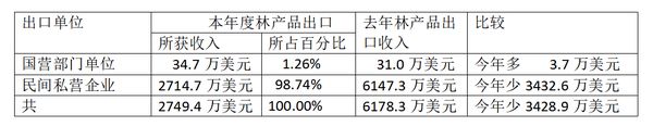 这期间林产品出口的情况,由国营部门单位出口34.7万美元,由民间私营企业出口2714.7万美元,故这期间林产品出口共为2749.4万美元。这当中由国营部门单位出口仅占1.26% 的比例,民间私营企业出口则占了绝大多数的比例,达到98.74% 的比例。