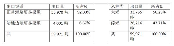 这8月份出口时,由海路渠道出口占了绝大部分,边贸渠道出口不足7%。而米种类中,大米出口比例超过56%,碎米出口比例不到44%。