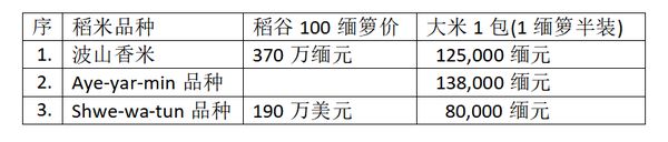 而在8月份最后一周内,瑞帽县区内,波山(Pawsan)香米品种稻谷及大米、Aye-yar-min品种稻谷及大米、Shwe-wa-tun(夏季稻)稻谷及大米等的行情价钱分别如下: