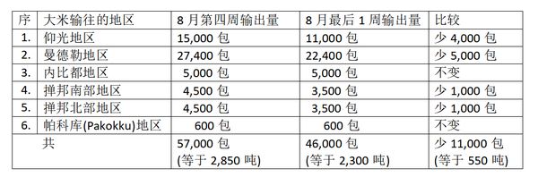 而最后两周内,瑞帽专区往其他省邦地区输出的大米数量如下表: