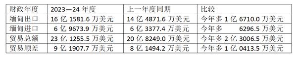 而上一财政年度同期内,在此边贸交易中,缅方出口为14亿4871.6万美元,进口为6亿3377.4万美元,贸易总额为20亿8249万美元。相比之下,现财政年度贸易总额比去年同期增加了2亿3006.5万美元。