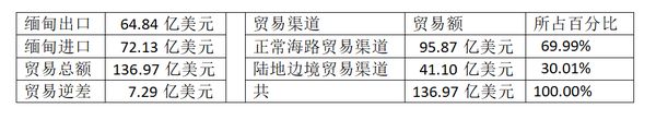 而在贸易渠道中,正常海路贸易渠道占了绝大部分的比例,几乎达到70%。不过边贸渠道的贸易额比例仍占有一定的比例,达到30%。这也可能是因为缅甸的两大贸易伙伴——中国与泰国都与缅甸进行边贸活动,故此边贸交易额在总体上能占有一定比例。
