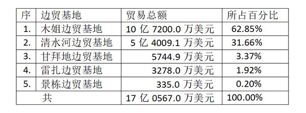 缅中5个边贸基地中,木姐口岸交易额位居第一,清水河位居第二。这2个边贸基地都是位于掸北地区,两个基地的贸易总额就占了缅中边贸的94%之多了。