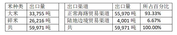 这当中,通过正常海路贸易渠道出口的大米碎米有55,970吨,通过陆地边境贸易渠道出口的大米碎米有4,001吨。
