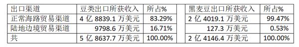 这期间豆类出口时,边贸出口占六分之一。但黑麦豆出口时,99%以上由海路出口,边贸出口仅占0.53%,只占一个零头而已。