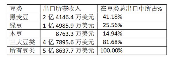 三大豆类出口共获得4亿7895.6万美元,占所有豆类出口总值的五分之四以上,其中黑麦豆出口值占所有豆类出口的五分之二,绿豆出口值占所有豆类出口的 ¼ 多。