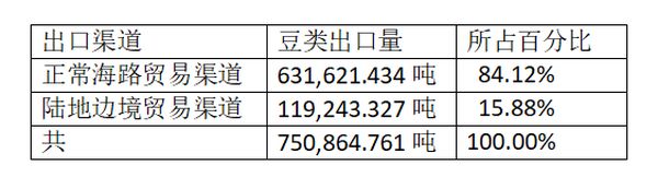 这5个多月里,由正常海路贸易渠道出口的豆类有631,621.434吨,由陆地边境贸易渠道出口的豆类有119,243.327吨,故这期间出口的豆类达到750,864.761吨,而且主要还是由海路渠道出口的为多。
