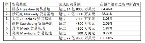 六个边贸基地口岸中,梯客口岸的贸易额占了整个缅泰边贸交易额的五分之三以上,位居各口岸之首。妙瓦底口岸贸易额位居第二,其贸易额超过缅泰边贸交易总额的 ¼ 。而其他边贸基地的贸易额就都只占一个零头而已了。而且这几个贸易基地中还有一个梅塞(Maese)边贸没有计算在内,不过该边贸基地位于克耶邦内,几乎没有什么交易额。