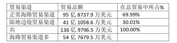 贸易渠道中,海路贸易渠道几乎占总贸易额的七成,边贸占3成。