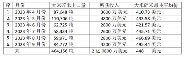 在2023—24本财政年度6个月内,每个月出口的大米碎米及所获收入如下表: