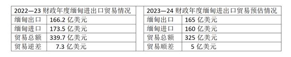 另据10月10日出版的《缅甸之光》报报导,2022—23财政年度缅甸的进出口贸易情况及2023—24财政年度进出口贸易预估数据分别如下表: