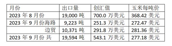 今年8月份及9月份缅甸玉米出口及创汇情况: