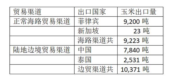 在9月份期间,出口菲律宾的玉米超过9,200吨,出口新加坡的玉米为23吨,共9,223吨玉米通过海路出口。同时,由边贸渠道向中国出口玉米7,840吨,向泰国出口玉米2,531吨,由边贸渠道出口的玉米共为10,371吨。