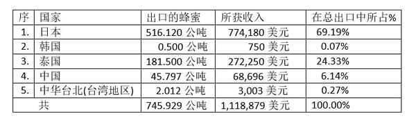 在这样出口时,主要出口到日本、韩国、泰国、中国及中华台北(台湾)等国家和地区,向各个国家地区出口的蜂蜜及所获得的收入如下表: