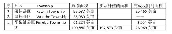 三个县区中,以果林县区规划种植面积为最多,几乎占全专区种植面积的一半。目前各县区完成的收割面积都还不多,温托县区甚至还没有开始收割工作,可能是由于地处北方,雨季到来的较晚,因而种植时间也就推迟了,现在收割工作也才开始展开而已。这地方虽然不是主要的稻米生产地区,现财年雨季稻实际种植面积只达到规划面积的96.41%。但还是尽力种植了这稻谷,完成收割工作的稻田每英亩稻谷产量78.52缅箩,与指标产量相比还有一段距离,但应该可以在一定程度上满足本地区民众们的需求了。
