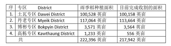 德林达依省内的4个专区现财年种植的雨季稻面积及目前完成收割的面积如下表: