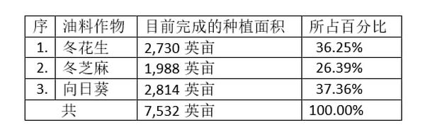 原本,那德林县区方面在现冬作物种植季节期间规划种植各种油料作物6,347英亩,在当地农民们努力耕耘之下,目前已实际种植7,532英亩油料作物,超过规划面积 1,185英亩。