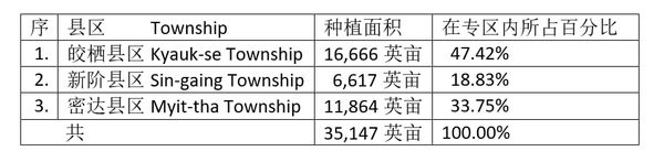 现财政年度期间皎栖专区内各县区所种植的棉花作物面积如下: