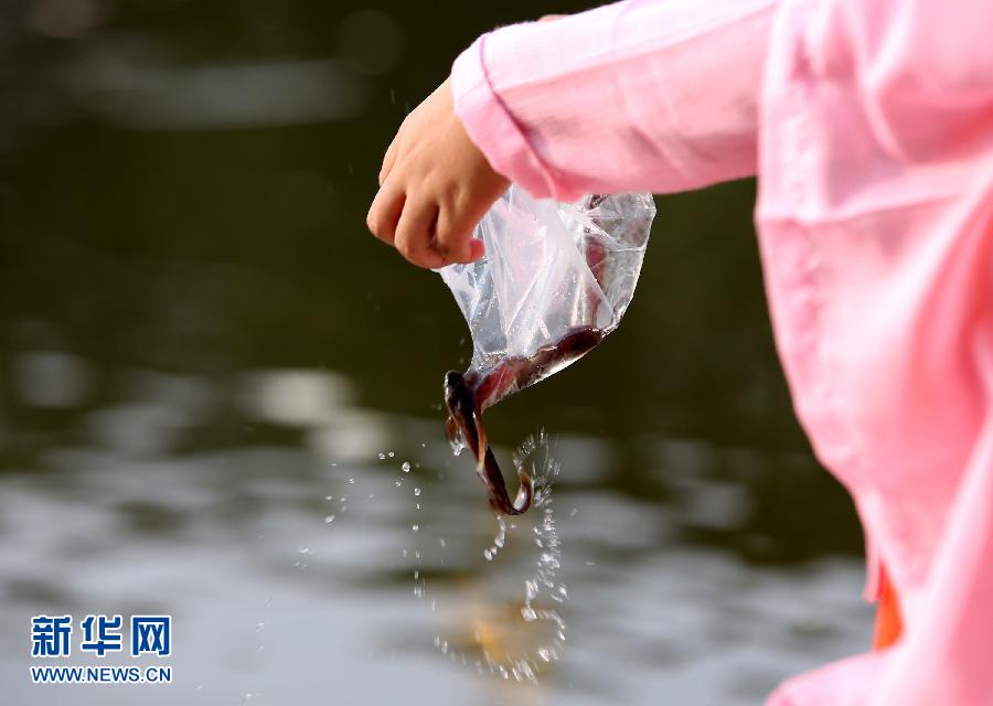 4月17日,一名尼姑在缅甸仰光大金塔附近放生。在为期4天的泼水节后,缅甸当日迎来缅历新年第一天,人们布施僧侣,将鱼鸟放生等,以求来年好运。新华社发(吴昂摄)