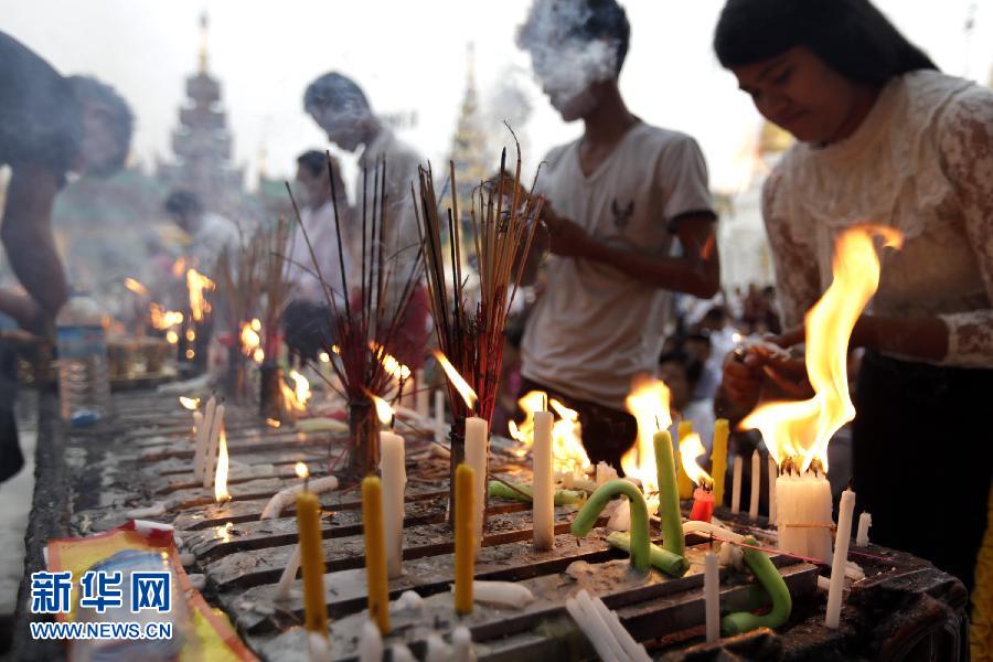 4月17日,人们在缅甸仰光大金塔烧香拜佛。在为期4天的泼水节后,缅甸当日迎来缅历新年第一天,人们布施僧侣,将鱼鸟放生等,以求来年好运。新华社发(吴昂摄)