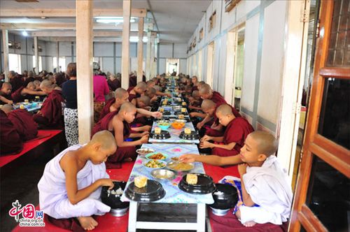 缅甸时间十点三十分,布施钟声敲响了俩下,僧侣们鱼贯而入,列队经过几个装满米饭的超大个的不锈钢的钵前,钵前有老僧人和前来帮忙的施主会把米饭放进就餐僧人的钵内。僧人们端着钵步入饭堂,坐在自己的位置上开始安静的就餐,佐餐下饭的菜花样很多很丰富,缅甸信奉的是小乘佛教,可以吃荤,这些菜是提前准备好摆放在餐桌上的。有的僧侣在餐厅用餐完后,还会把布施的点心带回僧舍的。那天布施的点心是中国满族的萨其马一样的点心。