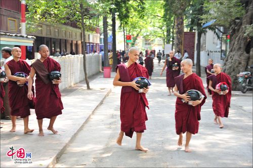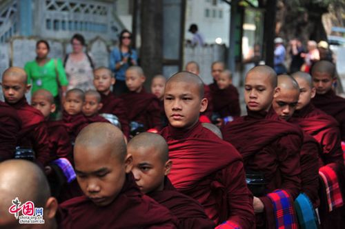 中国网4月22日讯 离开马哈牟尼佛塔,我们乘车前往马哈甘达勇僧院(又译:马哈伽纳扬僧院)观摩壮观的千僧宴。马哈牟尼佛塔周围的街道俩边有很多雕制佛像的店铺,段导游说这里是缅甸制作玉佛的重要中心,全缅甸的玉佛都出自于这里。穿街走巷,途中经过曼德勒市缅族人的居住区,缅族人的房子多数是竹子编制的竹楼,依然保留着原汁原味。