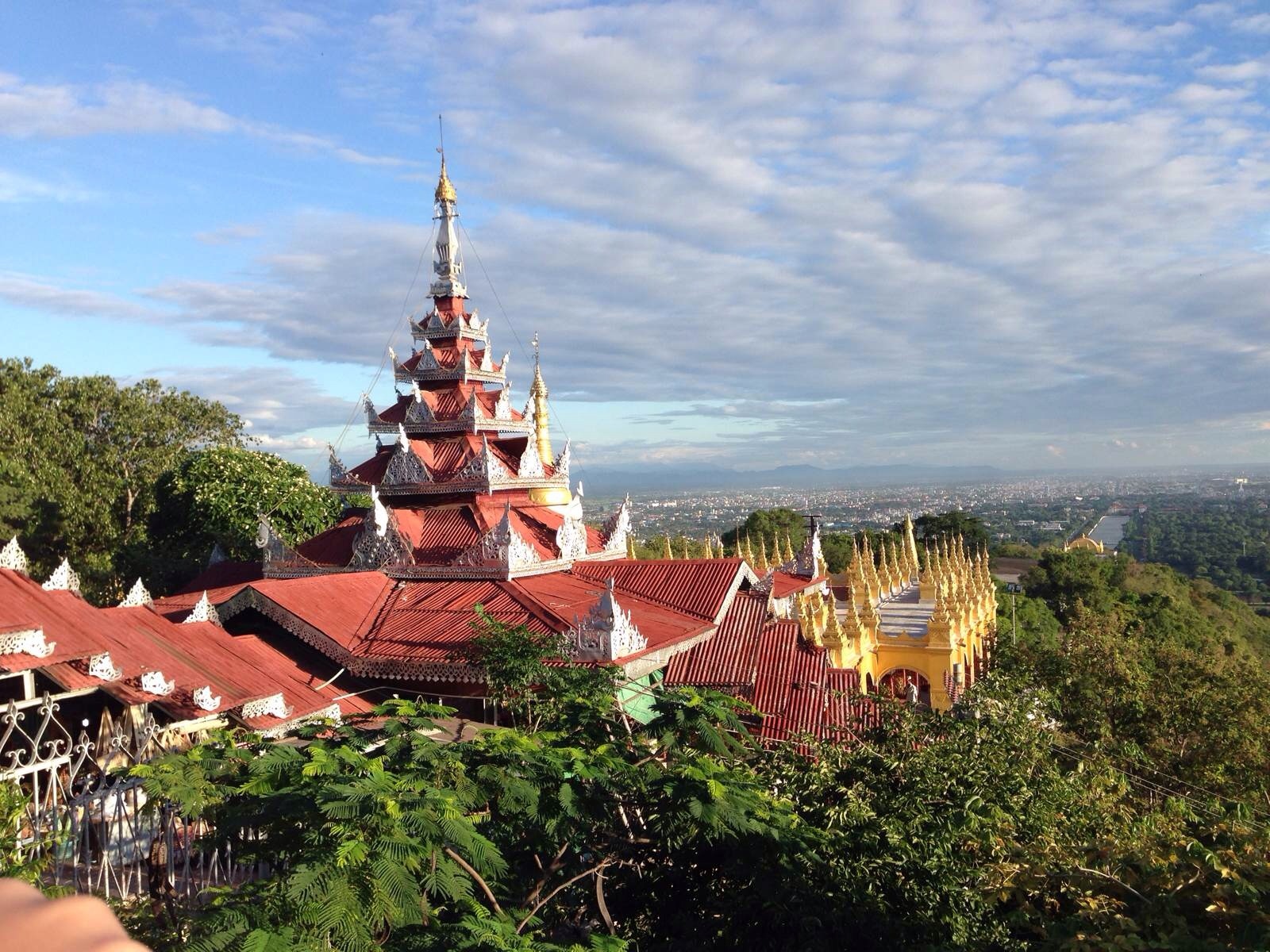 曼德勒山虽然不高,但座拥在市区之畔。著名的缅甸母亲河-伊洛瓦底江从天边宛然而来,弯弯曲曲绕过曼德勒山,向肥沃的平原流去,从山脚下沿着山坡逐级而上,有一千七百个台阶,沿途有八大寺庙。清晨太阳从曼德勒山后冉冉升起。山顶的塔尖以及绵延下来的塔廊,仿佛是一个剪纸的造型。上到山顶是一个印度教的神庙,四周是一根根方形的柱子,柱子上用玻璃镶嵌成棱形的图案,柱子之间斗拱相连,回廊贯通,在早晨的阳光下夺目耀眼,晶莹剔透,许多当地的缅甸人在印度教的神物-金环眼睛蛇的造型前,虔诚礼拜,不时把折叠好的缅币放到蛇头上,不知是祈求财运,还是平安。