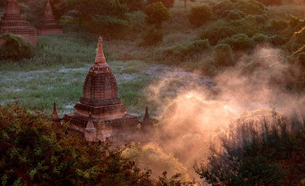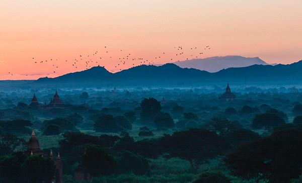 蒲甘的清晨有着最美的天际线,登上佛塔放眼望去,树冠如波,远山如黛,形态各异的塔尖错落于树冠之上,随着蒲甘平原的苏醒,在雾气中若隐若现。