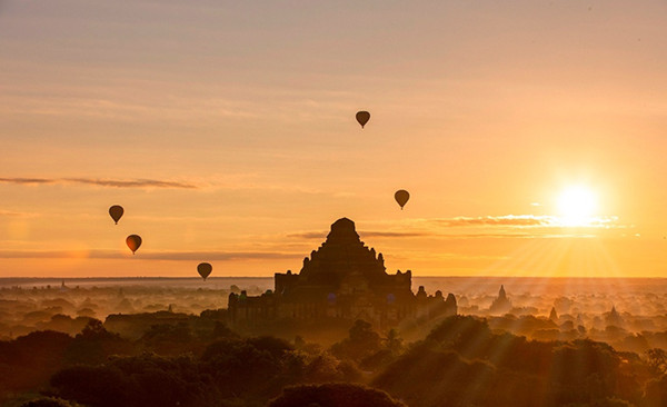 巨大的热气球缓缓升起,先是低低地掠过塔尖,继而高高飘飞在蒲甘平原橙色的天空中。
