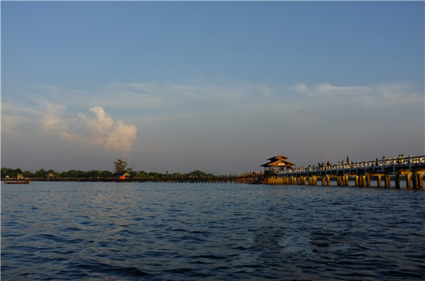 桥上有六座亭子,专为供行人休憩,华人告诉我,六座亭子表达了佛教的“六合精神”,是为同修相亲相爱的准则。亭子里有卖槟榔、缅桃的,还有各种缅甸本土的小挂饰。太阳已经偏西,挂在了远处佛塔的塔尖上,红彤彤圆滚滚一大个儿,放射出晕红的光,染红了半面湖水。那一刻,才真正的明白,何为“夕阳无限好。”