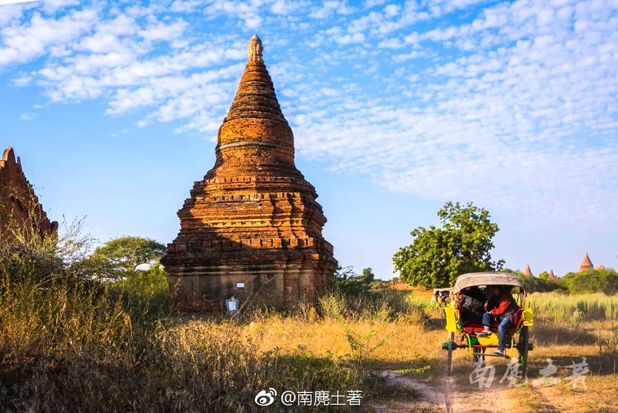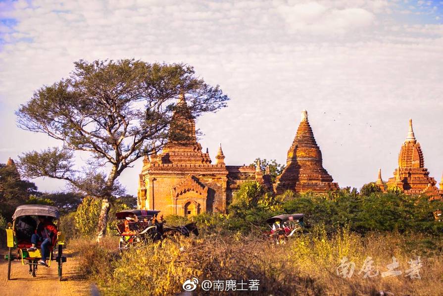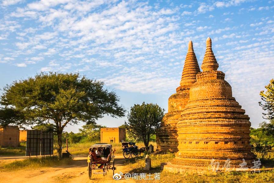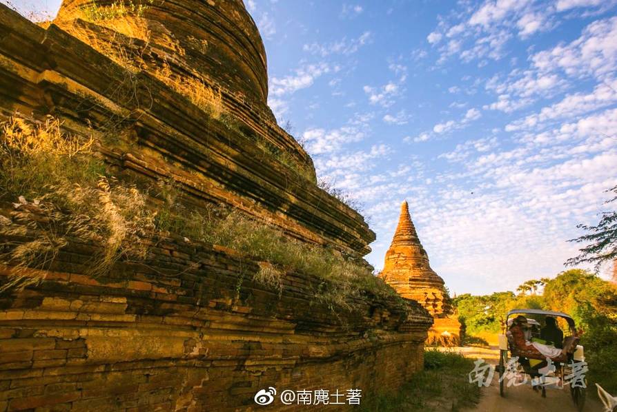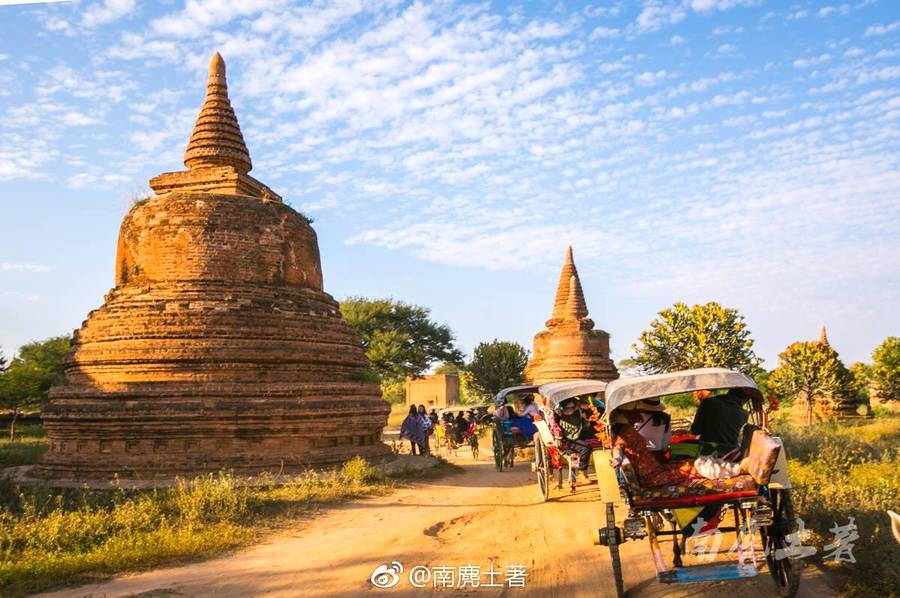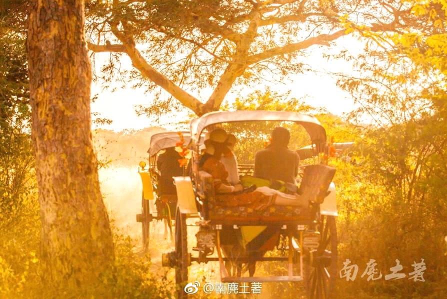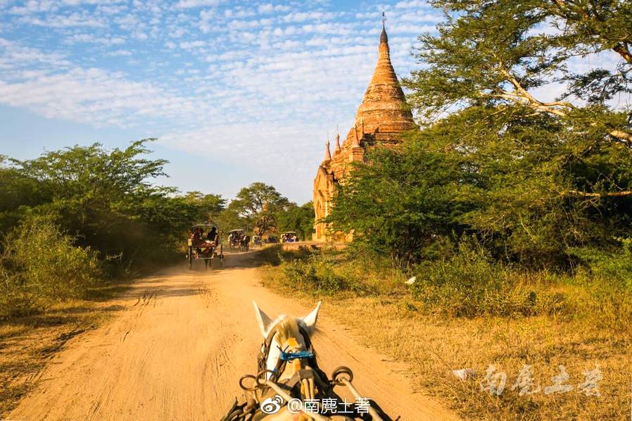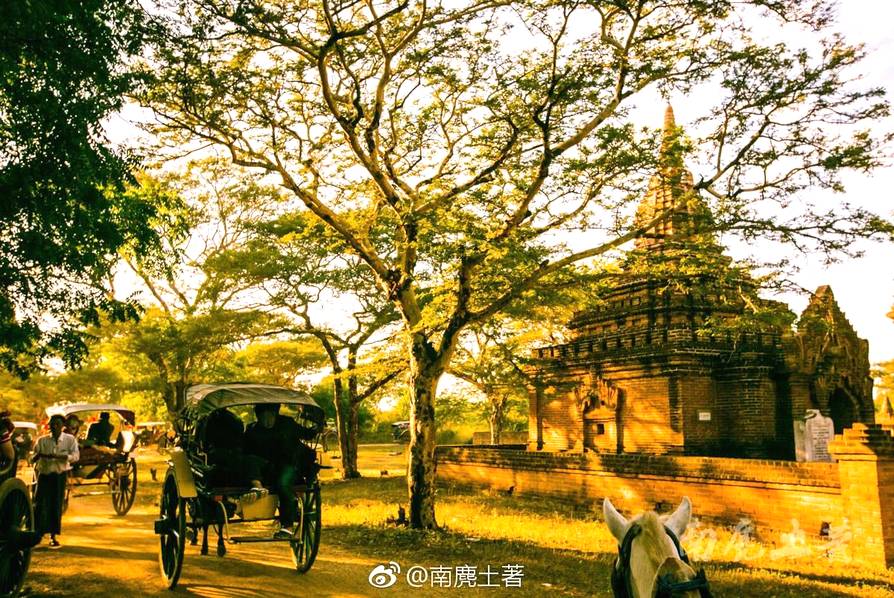蒲甘原野上散落着形形色色大小不一的佛塔,淹没或半裸于荒草之中,马车沿着乡间小路,穿越古树林间,阳光透过枝丫树叶,与扬起的灰尘呈现朦胧怀古情调,马蹄声由远而近,蝴蝶结阳帽,印花长裙,摇晃的古旧车影,幻若回到久远的年代。