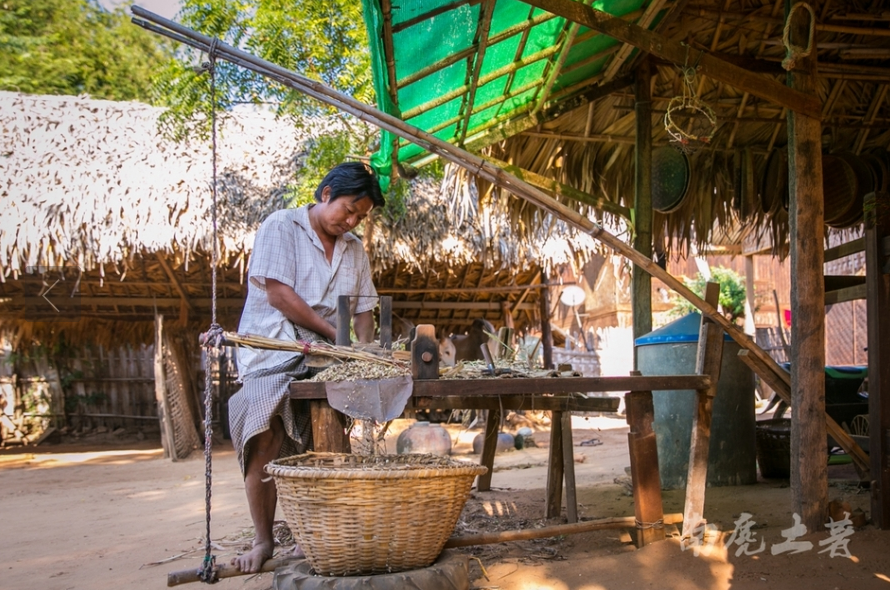 现在正是干季芝麻收成的季节,农妇将手工打下来的芝麻晒干后吹皮,竹篓匾不断翻腾,芝麻粒在她眼前群舞,粉尘飞扬。和其他农作物相比,栽种芝麻耗资较少,也较容易简单,在缅甸的油料作物中,芝麻的种植面积达到了50%,大部分都出口到了中国。