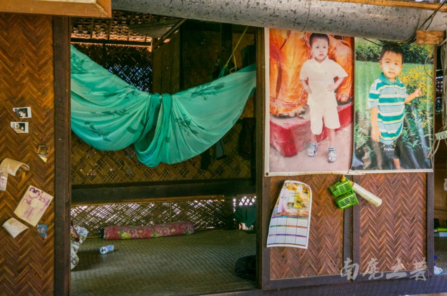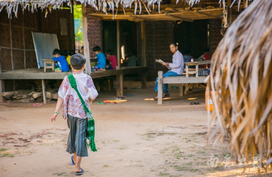 这一片宽阔一些的茅屋是村办学校,大小孩子混班,显然这个学生迟到了,老师目光犀利。缅甸政府比较重视发展教育和扫盲工作,小学实行义务教育,但学生的退学率却非常高,读着读着就去干活打工了。