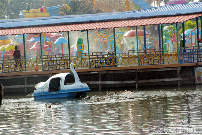 图为:游乐园内到小船,这个一般小孩和情侣玩的比较多,边上还有一群真鸭子在游来游去。在这个景点每一个项目都有人负责安全和卖票等服务,不过工作人员的年龄层很小,都是年轻人。当有人划船不是很讲规矩的时候,我们看到一个年轻人拿着喇叭在岸边提示。