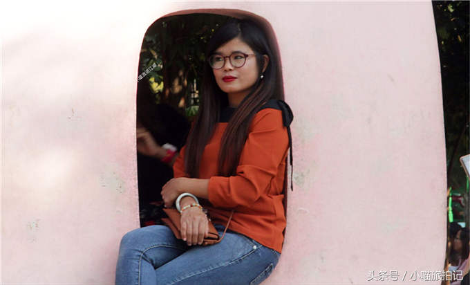图为:游乐园内一名女子正在拍照,这里有不少设备,专门让游客们拍照留念用的。