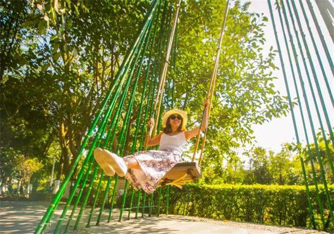 银井村的这座秋千坐落于国境线旁,后方一排绿化树之后就是缅甸的芒秀村,坐上去荡得大一些,便可瞬间“出国”,被称为“一座秋千荡两国”。