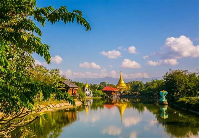 湛蓝的天空,一串串白云从天际飘过,绿荫环绕的村落,彩色的干栏式竹楼排列在水岸,金色的佛塔倒影于静谧水中,民族风情浓郁的瑞丽乡村,典型的南亚热带风光精致而浓烈。