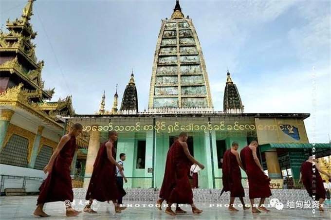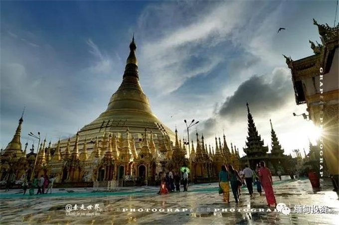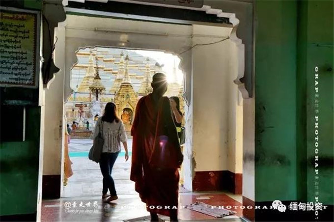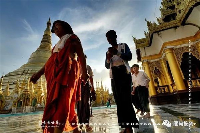 雨过天晴,碧空如洗,一群群僧侣领着信众从大金色塔下走过,犹如天神,阳光肆意投射在 湿滑地面上神圣而庄严。