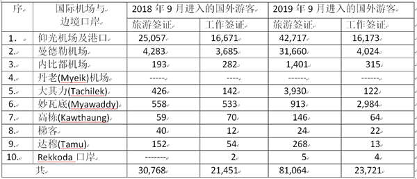 10月8日出版的《缅甸之光》报报导了2019年9月份进入缅甸的国外游客人数,包括旅游签证及工作签证在内,进入的国外游客人数超过10万人,与2018年同期相比增加了5.2万余人。具体数据如下表: