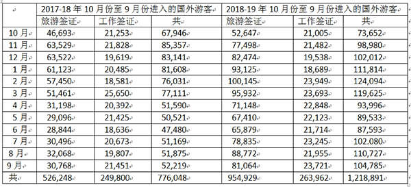 而自2018年10月至2019年9月每个月进入的人数如下表(与上一财政年度同期相比):