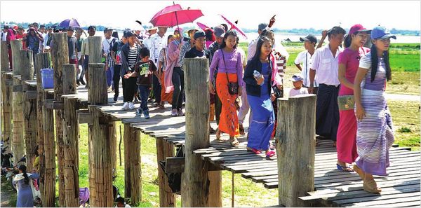 除了这多塔瓦底河畔的休闲营地外,曼德勒省内另一吸引人的旅游景点就是位于曼德勒市附近阿马拉普拉Amarapura镇区内的东达曼湖及乌本桥。据10月15日的《缅甸之光》报报导,这东达曼湖及乌本桥都是闻名海内外的自然文化遗产,特别是乌本桥,据说是世界上最长的木桥,又被人称为“情人桥”,平常日子这里就已是游客不断,逢到节假日,特别是碰到今年直粦卒的长假,更是人满为患。旅客们在东达曼湖内泛舟游览,在乌本桥上与亲人们携手同行,感受亲情、友情的温馨。周边还有不少店铺出售当地的小食品、纪念品等。成千上万游客的到来,不仅促进了旅游业的发展,也带动了周边一些行业的发展。