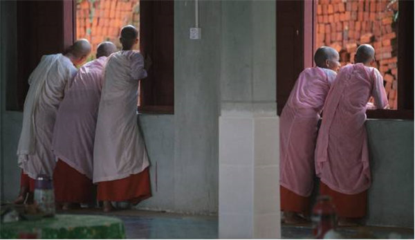 如果你想在世界上找一个禅修的朝圣之旅,缅甸会给你很多选择。你可以选择在仰光附近的禅寺静修,也可沿着伊洛瓦底江深入佛国秘境,在山里修行。在此次航行最北端八莫市, 再乘快船半个小时,就有一座叫作Thein Pa Taung的静修中心。我们抵达时,很多小尼姑正在一座高脚屋里上课。再往里走,发现女修士们三五成群,正进行一场诡异的走路仪式。她们向前迈着脚步, 像被定格了的电影画面,生怕不小心踩坏了眼前的空气。一位女上师告诉我,她们正在进行行走式冥想锻炼。这里主收女学徒,教授的心法没有宗派之见,纯粹是为了帮助学员修身养性,发现自我。